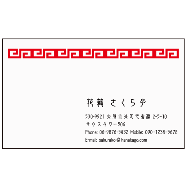 ◆用紙 マシュマロ180K 発色のいい仕上がり ◆サイズ 91mm×55mm普通名刺サイズ ◆下記より用紙の変更できます 用紙の変更はこちらから https://osharemeishi.theshop.jp/categories/7156978 ◆書体の変更 カートでは1種類の選択だけとなりますので 2種類以上ご希望の場合はカートに入れた後に表示される 購入情報入力の備考欄にご入力ください 詳しくは書体見本ページをご覧ください https://osharemeishi.theshop.jp/categories/7155022 中国デザイン雷紋。中華料理、ラーメン店のショップカードや お店の方にも。 漢方や薬膳のお仕事、セラピストの方、アジアデザインや中国デザインの お好きな方にもオススメです。