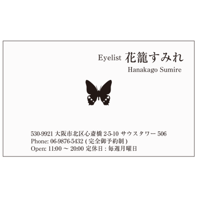 ◆用紙 マシュマロ180K 発色のいい仕上がり ◆サイズ 91mm×55mm普通名刺サイズ ◆下記より用紙の変更できます 用紙の変更はこちらから https://osharemeishi.theshop.jp/categories/7156978 ◆書体の変更 カートでは1種類の選択だけとなりますので 2種類以上ご希望の場合はカートに入れた後に表示される 購入情報入力の備考欄にご入力ください 詳しくは書体見本ページをご覧ください https://osharemeishi.theshop.jp/categories/7155022 ◆おすすめの用紙 エスプリコート 大きな蝶は羽がハートのおしゃれなデザイン。 ネイリストさん、アイリストさん、おしゃれなお仕事の方にもおすすめ。 ショップカード、名刺にお使いいただけます。 シンプルなモノクロデザインはプライベートにもビジネスにもお使いいただけます。