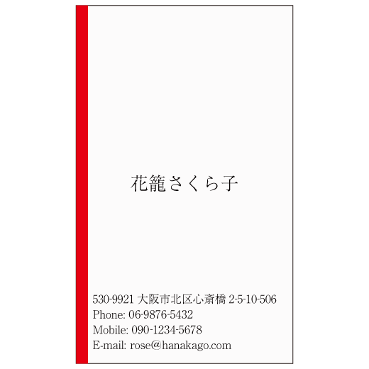 赤いラインのタテ型名刺。赤のラインの横型名刺もあります。