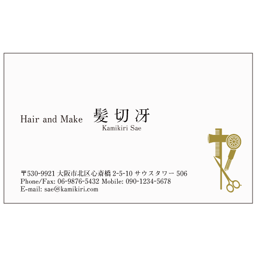 美容師さんにおすすめのゴールドのコーム、シザー、ドライヤーの3点名刺。
