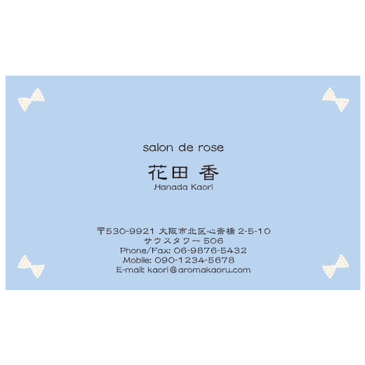 パールのリボン名刺ブルー。ロマンティックなデザインがお好きな方におすすめです。